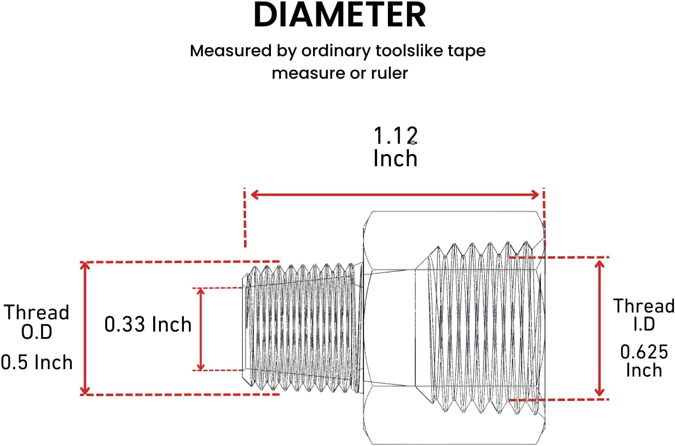 THREAD OD/ID: If your measuring tools are a ruler and a vernier caliper, then the correct size is thread OD (1/2 inch) and thread ID (5/8 inch).