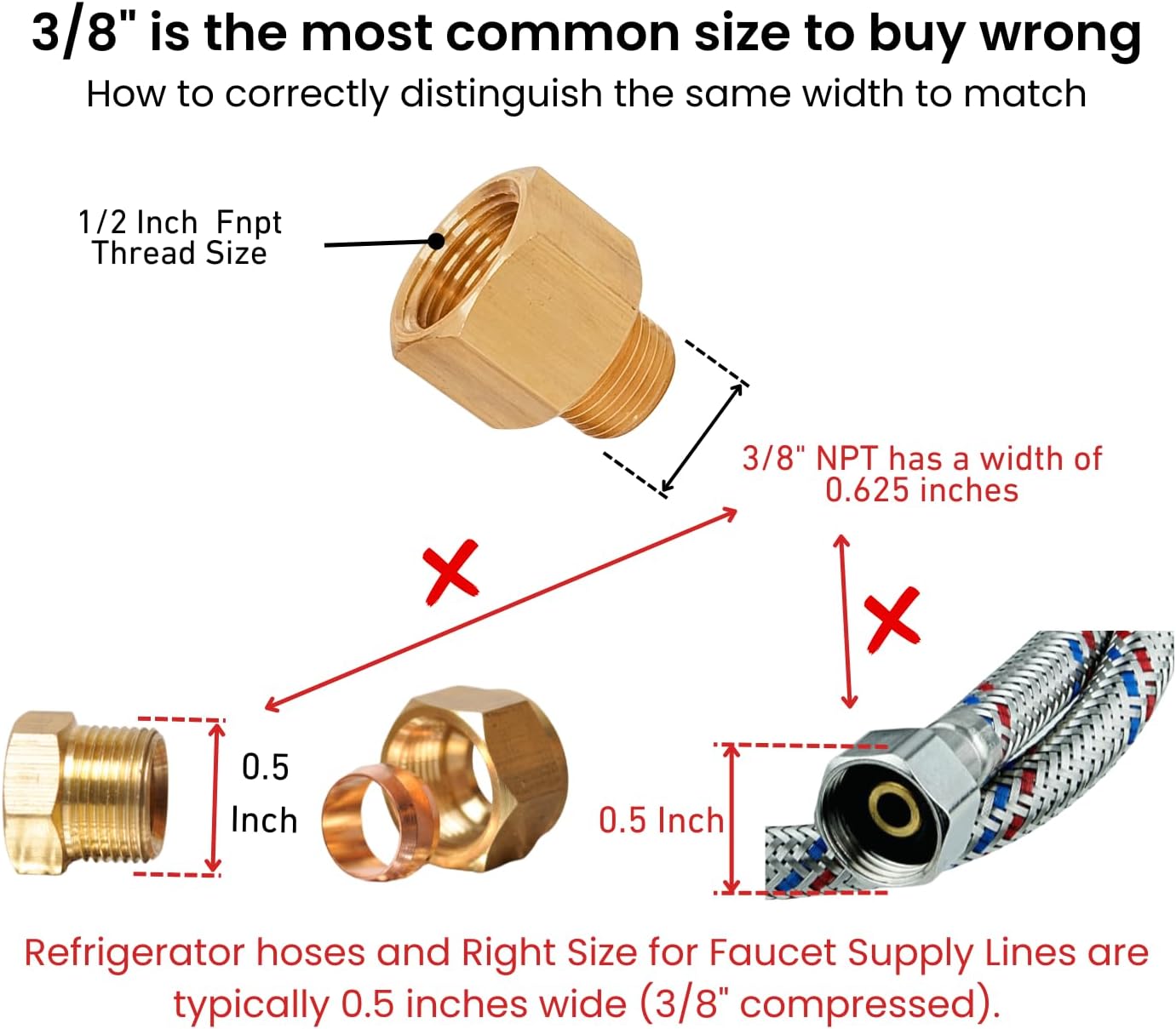 NPT THREAD SIZE & FITMENT: Fits standard 1/2" NPT Female to 3/8" NPT Male reducer adapter threads. NPT is a nominal pipe size, not actual diameter. Approx. 0.75" ID × 0.625" OD. Please confirm size before ordering.