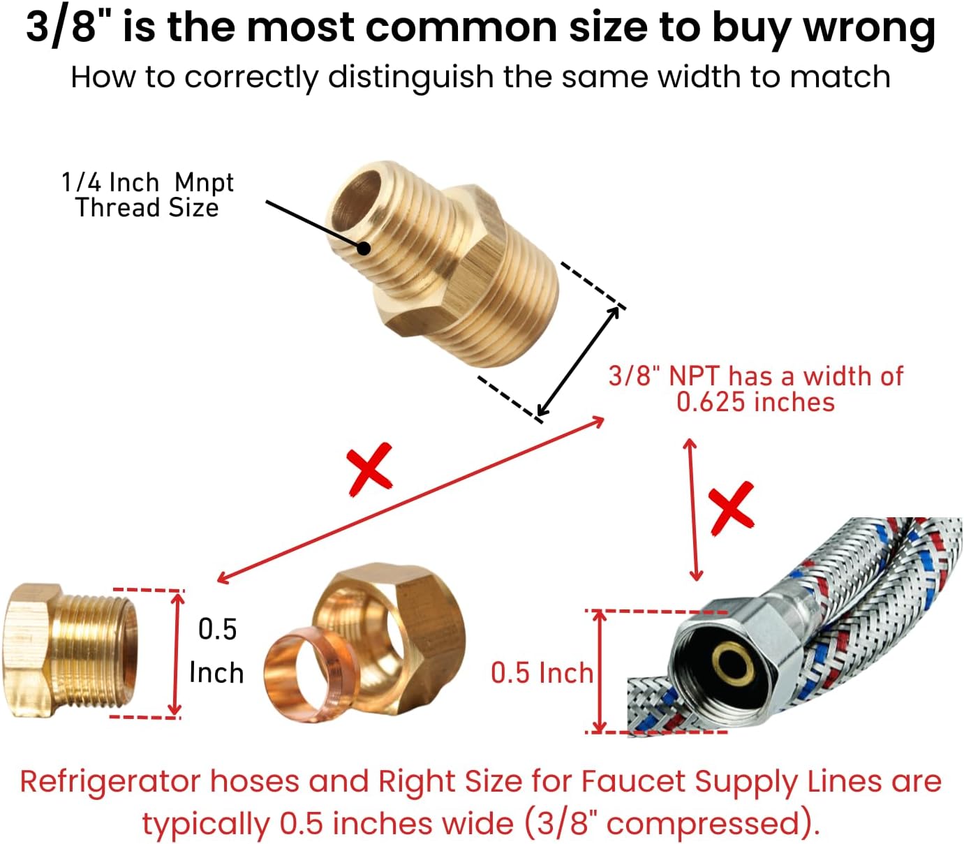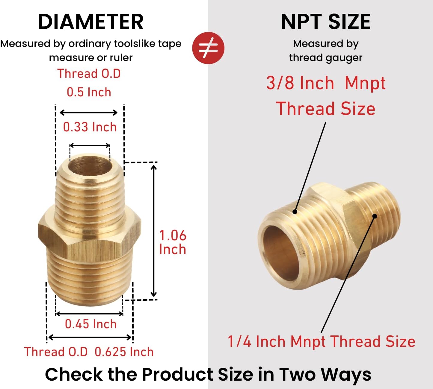 ACTUAL FITTING SIZE: 5/8" OD × 1/2" OD – Although the thread sizes are 3/8" NPT and 1/4" NPT, the actual outer diameters measure approximately 5/8" and 1/2", respectively. NPT thread sizes are nominal and do not represent actual measurements. These threads have a 60° taper and typically do not screw completely flush. Please refer to the size chart and verify dimensions before purchase.
